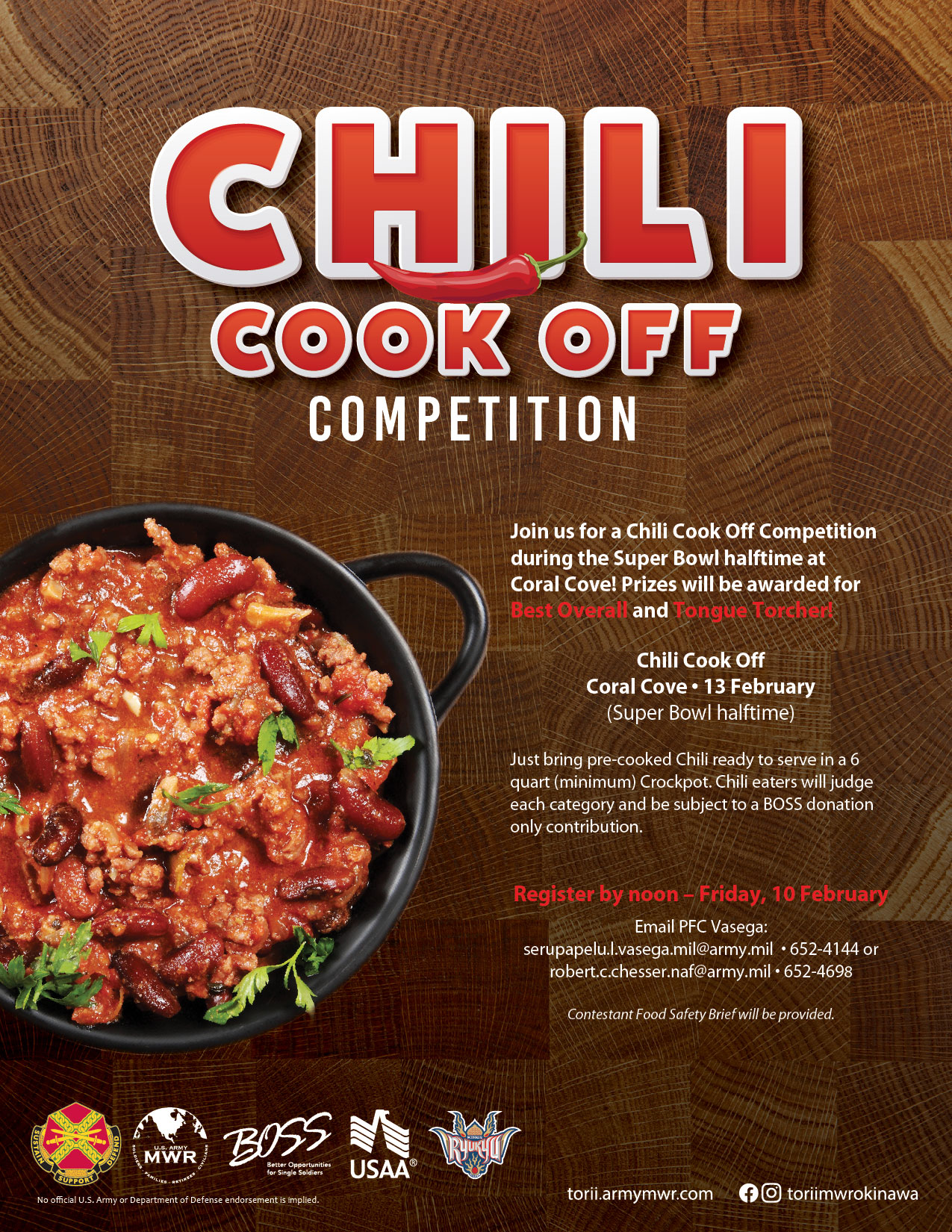 Join us for a Chili Cook off competition during the Big Watch Party at Coral Cove!