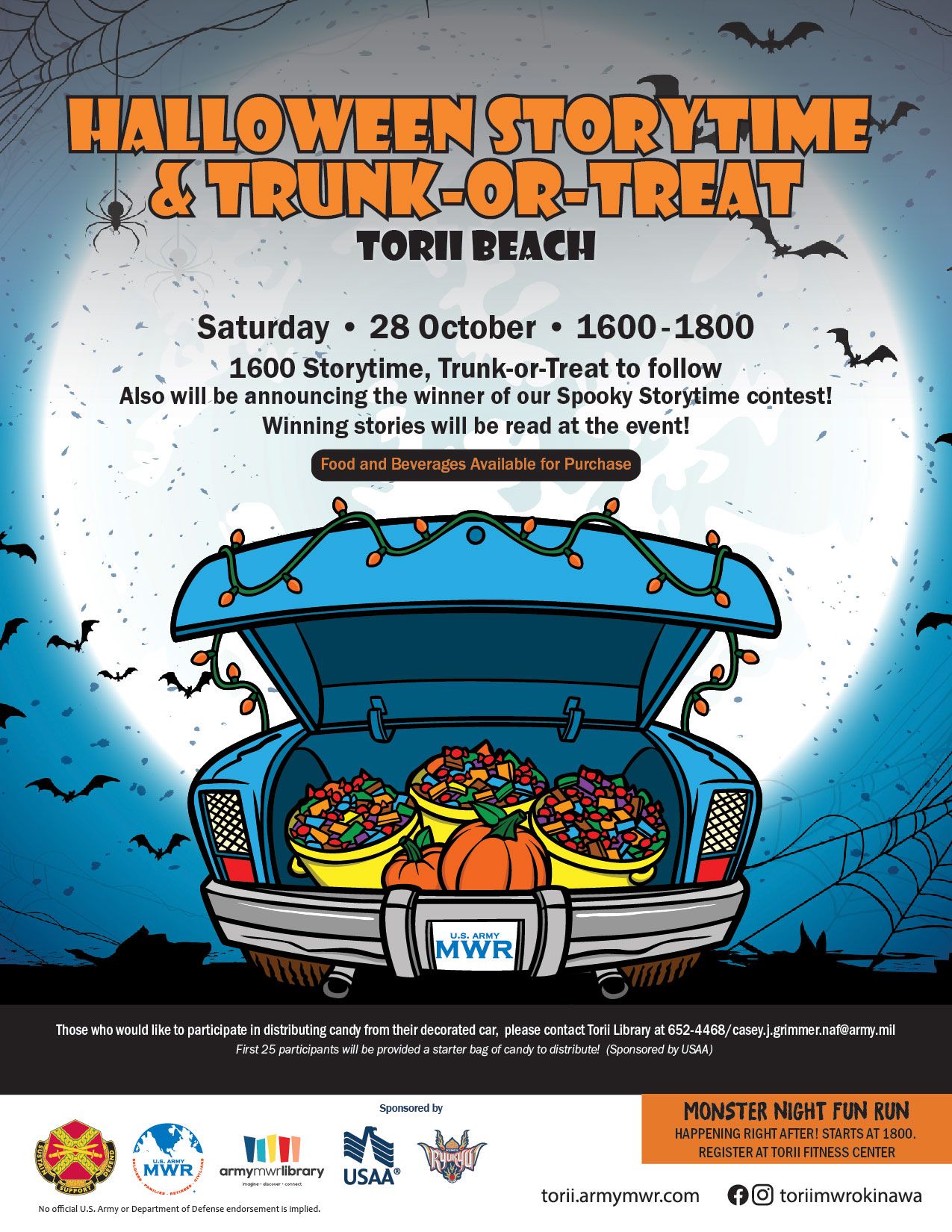 Those who would like to volunteer to decorate a car and distribute candy please contact the Torii Library at 098-962-5335 (direct) /652-4468 (DSN) or casey.j.grimmer.naf@army.mil