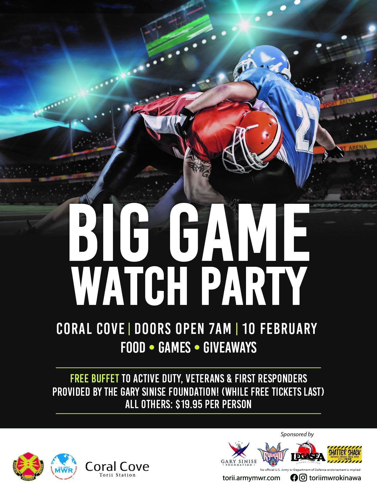 Join us for the Big Game Watch Party at Torii Station's signature club, Coral Cove!