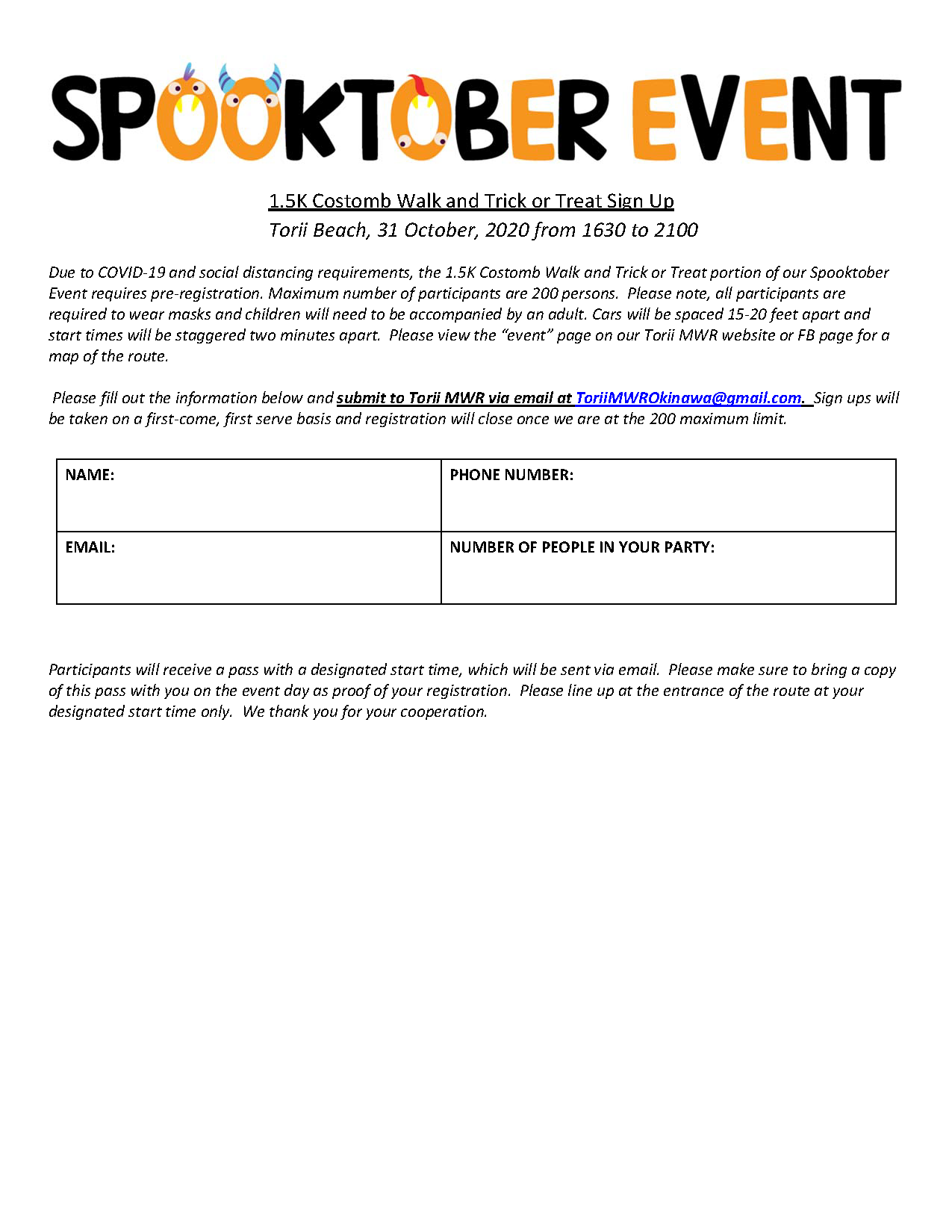 Pre-registration is required for the walk/trick or treat portion. Registration form can be found on this "event" page and must be sent via email at Toriimwrokinawa@gmail.com. Children must be accompanied by an adult. Maximum of 200 persons, sign ups will be taken on a first-come, first serve basis and registration will close once we are at the 200 maximum limit. Please click here to complete the registration form.