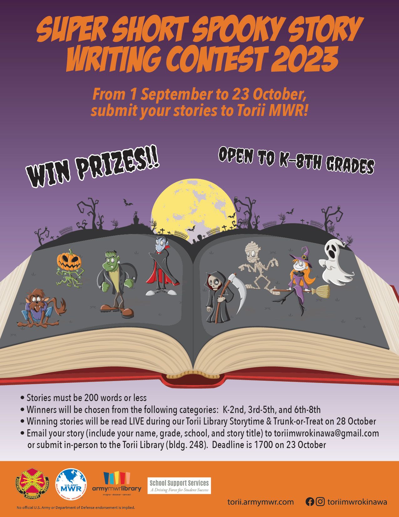 Submit your original stories (stories should be less than 200 words) via email at toriimwrokinawa@gmail.com or submit in-person to Torii Library (Bldg. 248)
