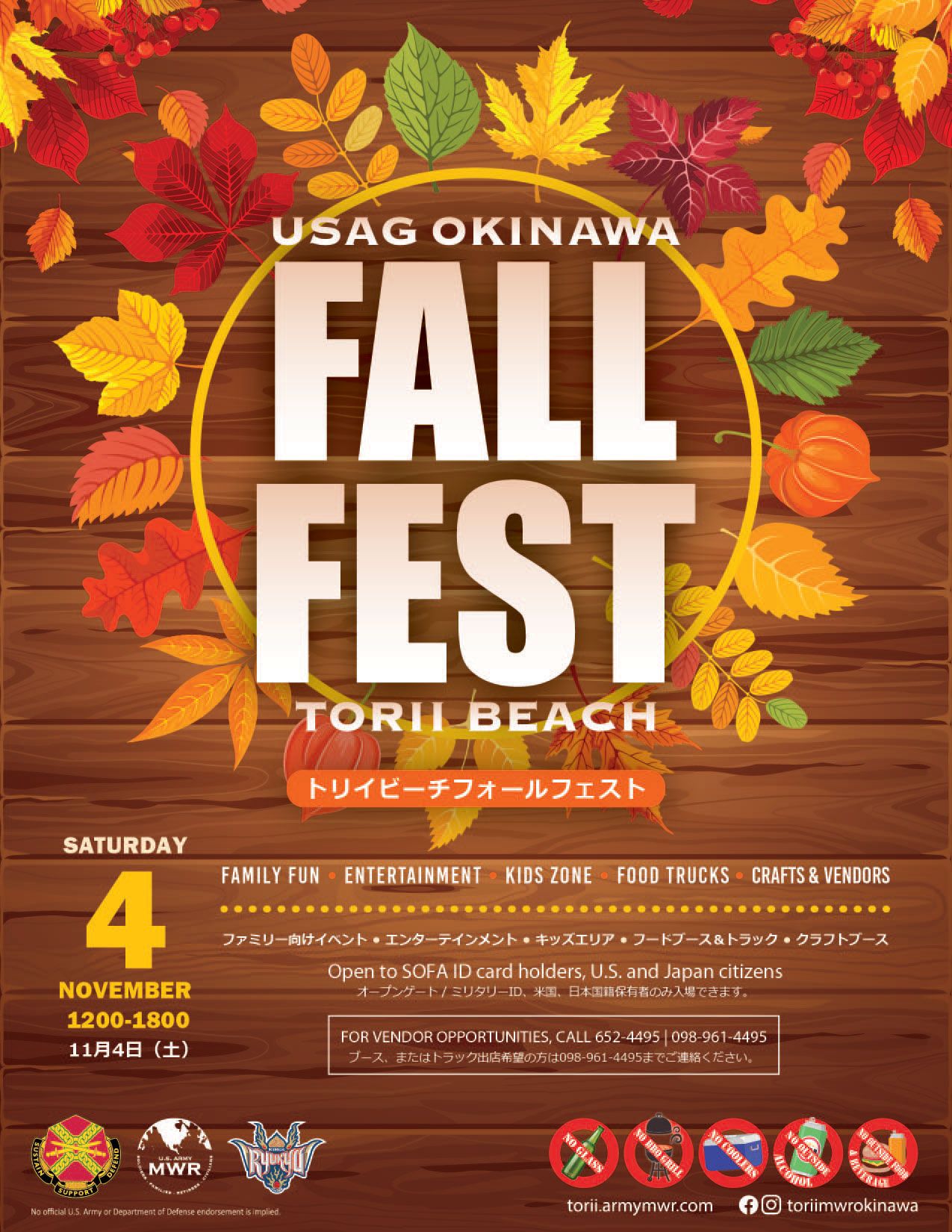 Save the date! Join us for our Torii Fall Fest, Saturday, 4 November, 2023 from 12pm to 6pm on Torii Beach! This is an open post event (open to all SOFA and Japanese nationals with valid photo ID). Japanese nationals can enter through gate 4 (Toguchi Gate). Entry is free! Great fun for the whole family! Enjoy entertainment, food & craft vendors, a kiddie play area (fee area), & more. Click here to download the flyer.