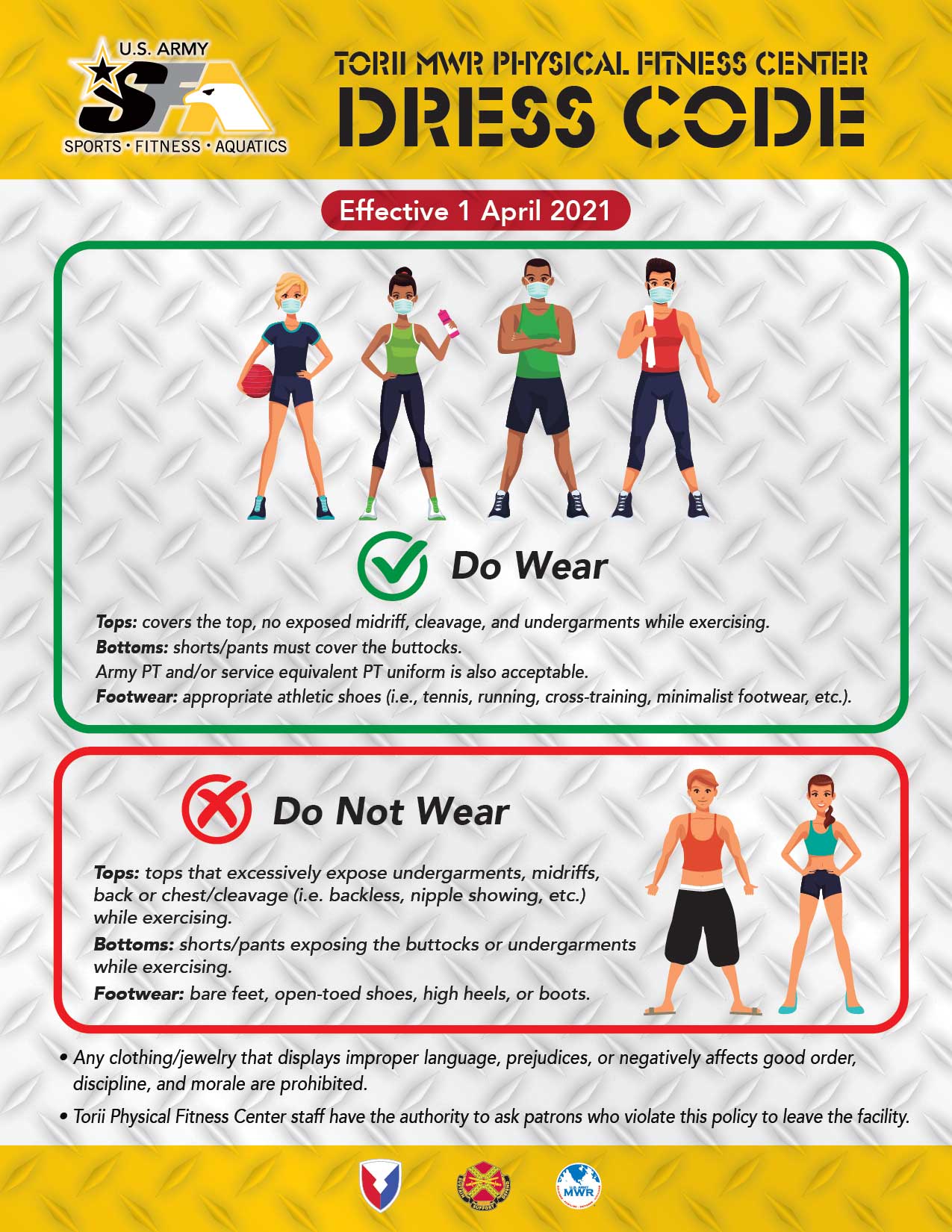 Attention Patrons: Effective 1 April, 2021, Torii Physical Fitness Center will implement the following dress code. For the full poster, click here.