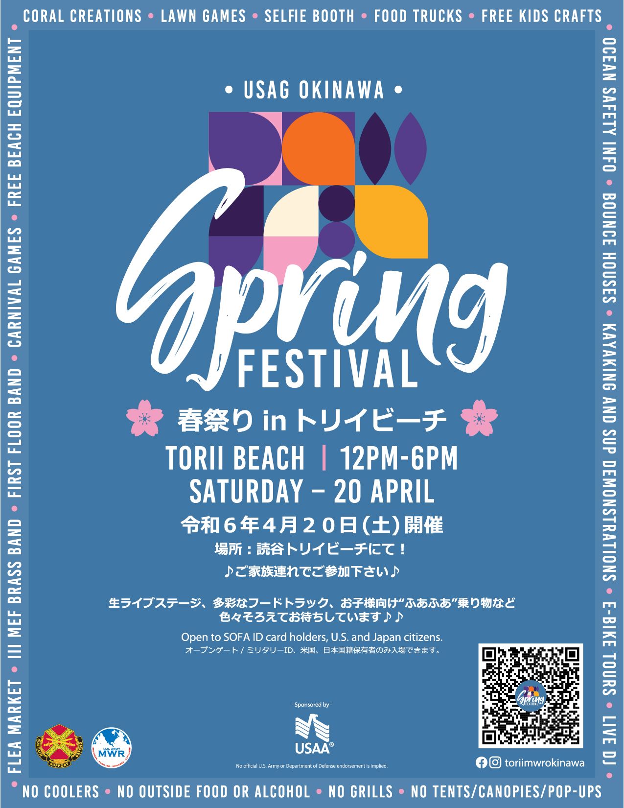 Join us at the USAG Okinawa Spring Festival at Torii Beach! Enjoy a variety of food trucks, craft vendors, giveaways, entertainment and more!