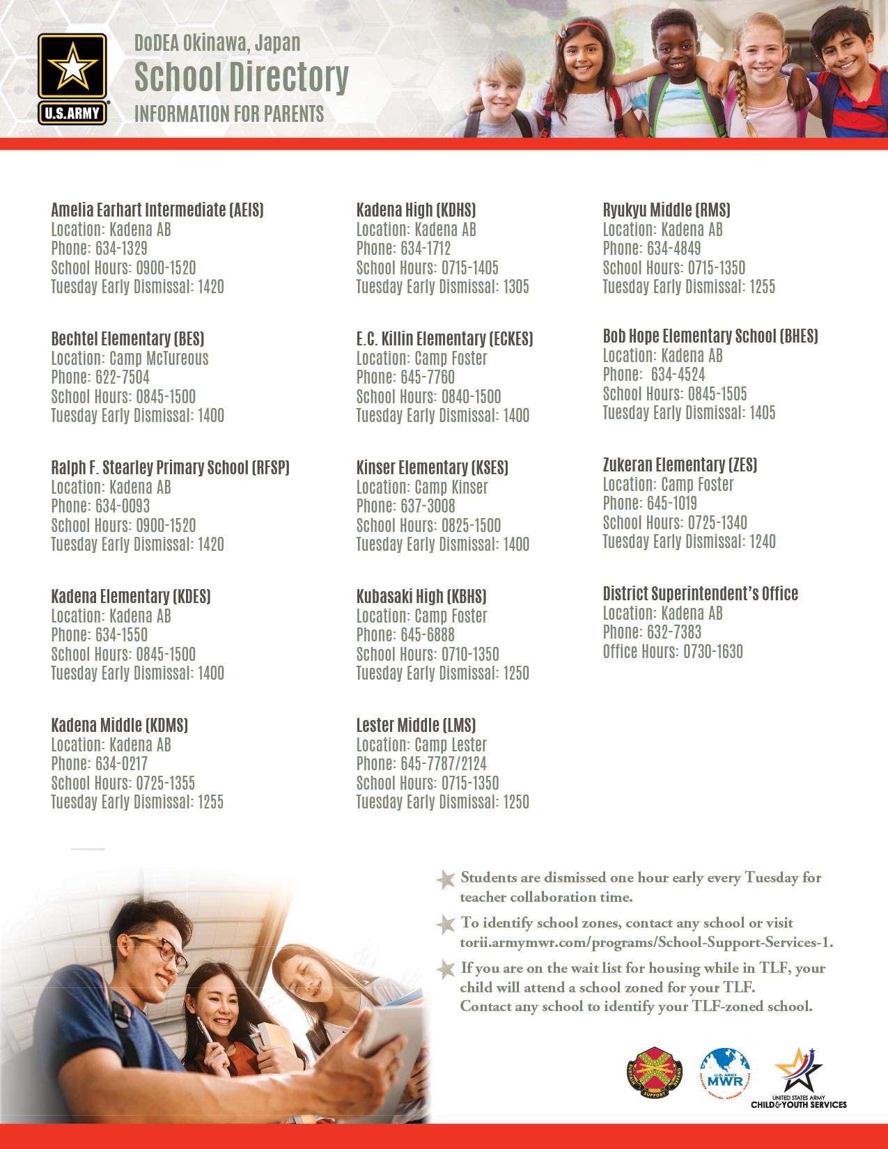 Students are assigned a school based on where they live. To identify your child's school zone, contact the front desk of any Department of Defense Education Activity (DoDEA) school or view the school zone roster online.